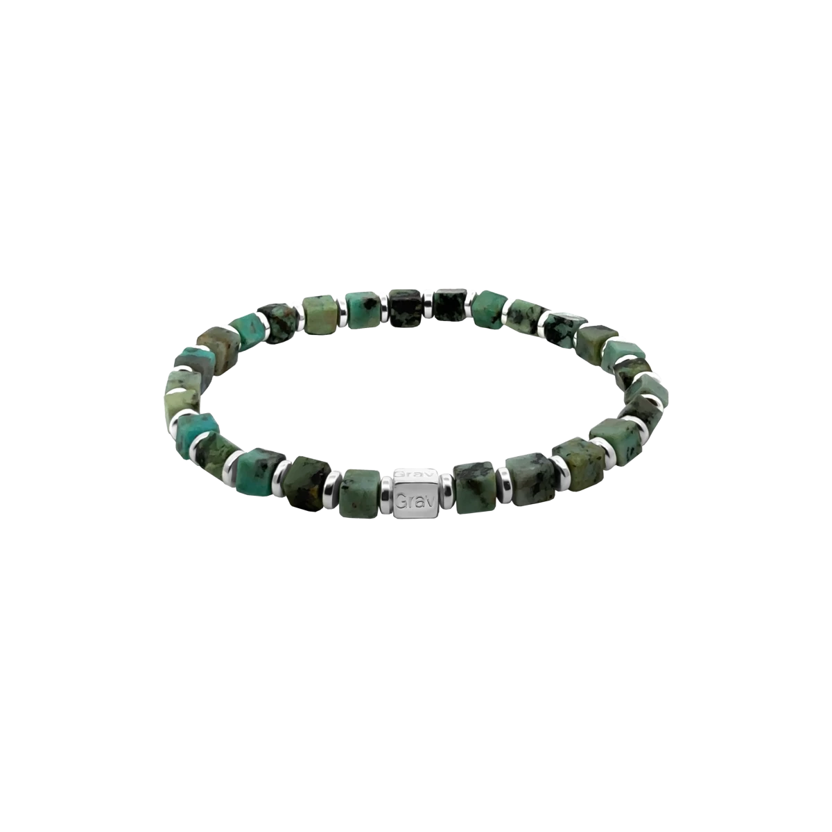 Az ízlésesen megkomponált, kis afrikai türkiz kockákból, hematit kiegészítőkből és egy kiemelkedő ezüst 925 kockából álló férfi karkötő nemcsak látványos ékszer, hanem az afrikai türkiz inspiráló és védelmező erejét is magában hordozza. Úgy tartják, hogy az afrikai türkiz segít oldani a stresszt, támogatja a belső egyensúlyt, erősíti az önbizalmat és fokozza a magabiztosságot – így viselője harmóniában, belső erővel és pozitív energiával vághat neki mindennapjainak.
