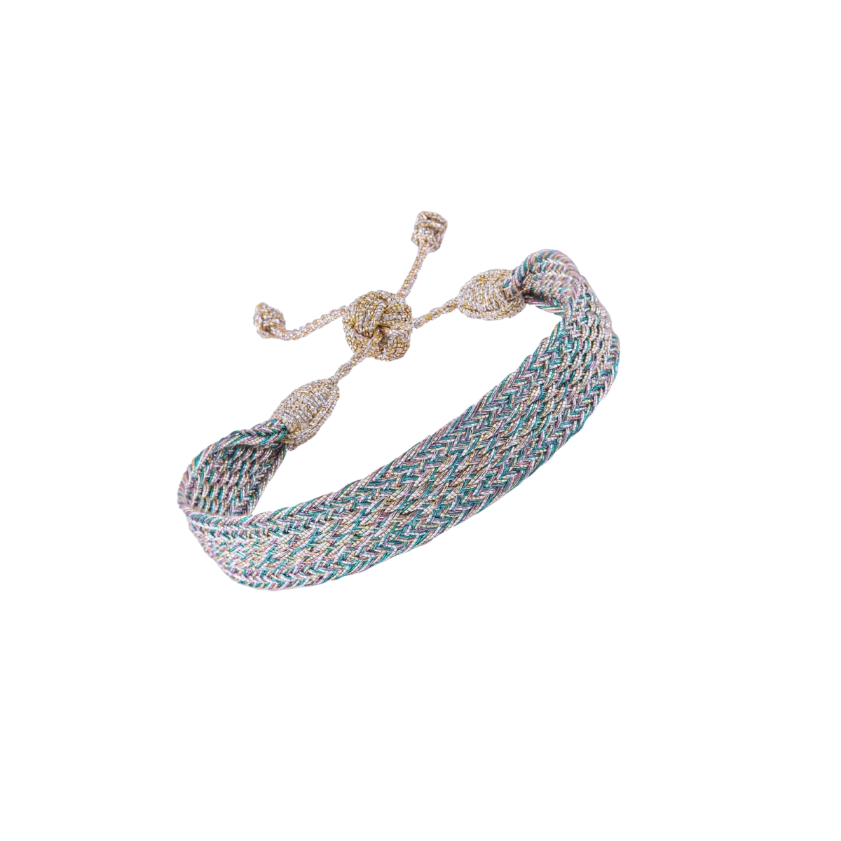 Kézzel készített karkötő, előállítási ideje több, mint 3 óra. A domináns szín a Tiffany kék, amely friss, elegáns türkiz árnyalatával különleges és magával ragadó hatást kelt. Az anyagot arabul „Sfifa”-nak hívják, hagyományos aranyszálak szövéséből készül. Magával ragadó színválasztékával ez a darab feldobja megjelenésedet. A szövet vízálló, azonban a hosszabb élettartam érdekében zuhanyzás, házimunka vagy edzés közben ne viseld! A csúszócsomóknak köszönhetően a karkötő mérete 14 és 23 cm között állítható.