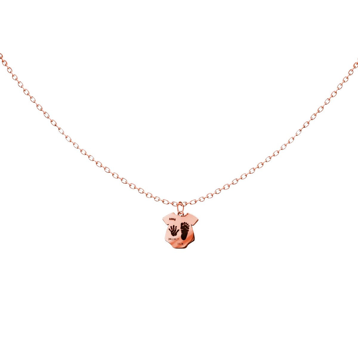 Kedves ajándék újdonsült szülőknek :-) Nyakláncon egy cuki, baby body alakú medál, tenyér- és talplenyomatot, valamint a születési adatokat (dátum, időpont, súly) tartalmazó gravírozással. A szükséges adatokat megjegyzésben jelezd nekünk! A medál mérete: 12x12 mm.