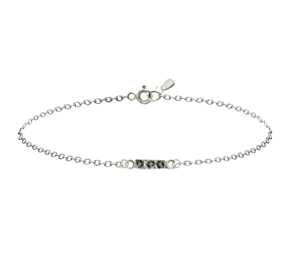Ez a karkötő maga az időtlen elegancia, a három fekete cirkónia kő ragyogóvá varázsol minden alkalmat. A kézzel megmunkált finom karkötő elegáns kiegészítő, hiszen minden szettet feldob. Válassz mellé köves nyakláncainkból és alkosd meg egyedi stílusod. A kövek mérete 1 mm - 2.5 mm.
