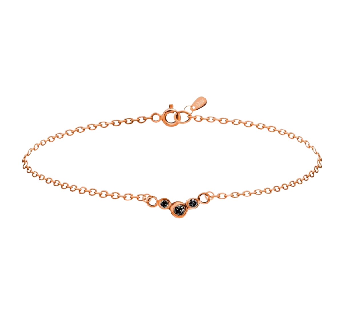 Ez a karkötő maga az időtlen elegancia, a három fekete cirkónia kő ragyogóvá varázsol minden alkalmat. A kézzel megmunkált finom karkötő elegáns kiegészítő, hiszen minden szettet feldob. Válassz mellé köves nyakláncainkból és alkosd meg egyedi stílusod. A kövek mérete 1 mm - 2.5 mm.