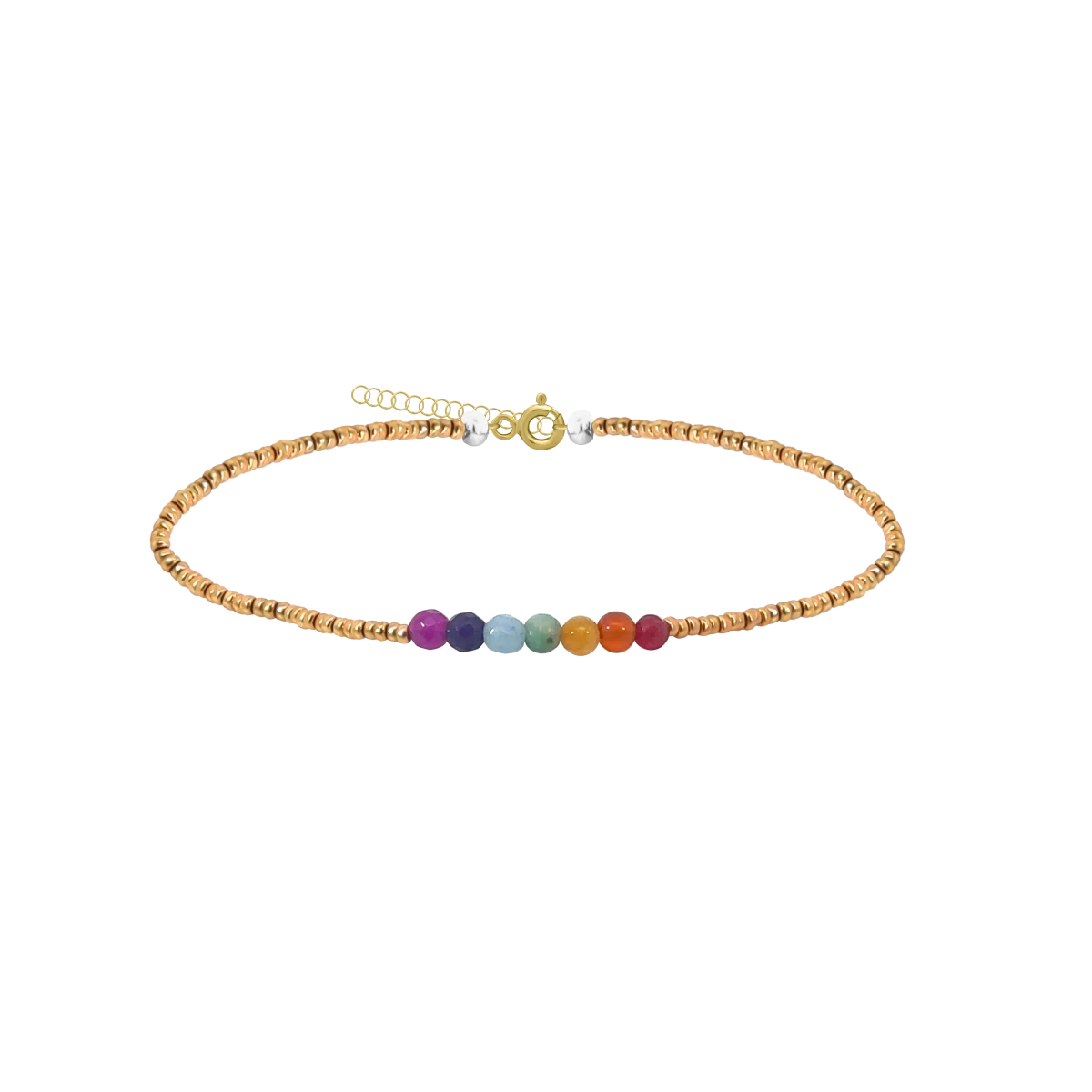 Elegáns, kézzel készült csakra karkötő a 7 csakrát jelképező színű ásványokkal és arany színű design gyöngyökkel, amely harmonizálja az energiákat és támogatja a belső egyensúlyt. A spirituális jelentéssel bíró kristály karkötő nemcsak különleges ékszer, hanem a tudatos életmód stílusos kiegészítője is. Sárga arannyal bevont ezüst lánchosszabbítójának köszönhetően mérete rugalmasan állítható, így kényelmes viselet mindennapokra vagy ajándéknak is ideális.