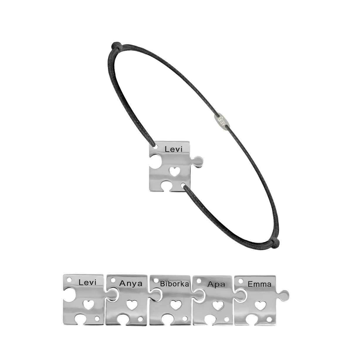 Stílust és érzelmet egyesít ez a különlegesen tervezett puzzle formájú karkötő, ahol mind az öt medál gravírozott üzenete a viselő és szerettei közötti kapcsolatok mély, személyes jelentőségét tükrözik, épp úgy szerelmespárok, barátok és családok számára. A medálokra gravírozandó neveket, a karkötők méretét és a választott fonalszínt a Megjegyzés mezőben jelezd nekünk!