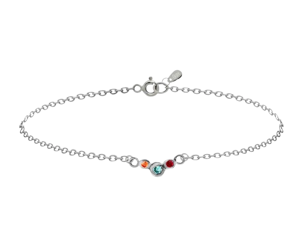 Ez a karkötő maga az időtlen elegancia, a három színes cirkónia kő ragyogóvá varázsol minden alkalmat. A kézzel megmunkált finom karkötő elegáns kiegészítő, hiszen minden szettet feldob. Válassz mellé köves nyakláncainkból és alkosd meg egyedi stílusod. A kövek mérete 1 mm - 2.5 mm.