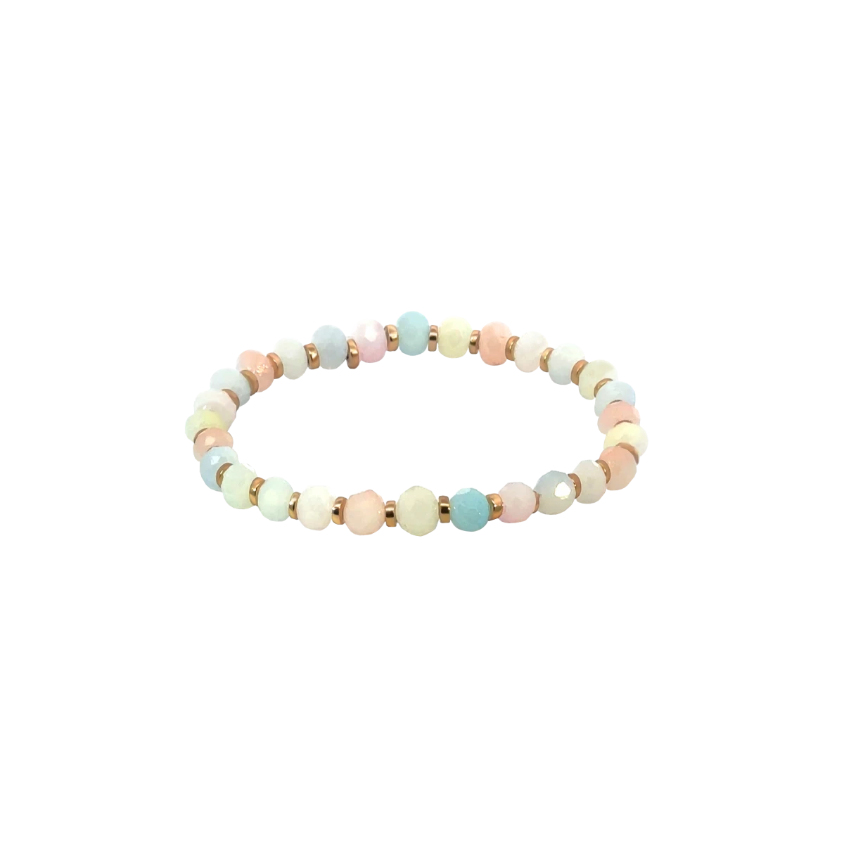 Elegáns, kézzel készült karkötő pasztell rózsaszín, fehér, kékes és sárgás árnyalatú kristályokkal, melyet arany színű hematit elemek tesznek különlegessé. A zár nélküli, letisztult kialakítás modern, kényelmes viseletet biztosít, miközben a finoman csillogó részletek luxus hatást kölcsönöznek. Tökéletes választás nőies, egyedi ékszert keresőknek, akár mindennapi hordásra, akár ajándéknak.
