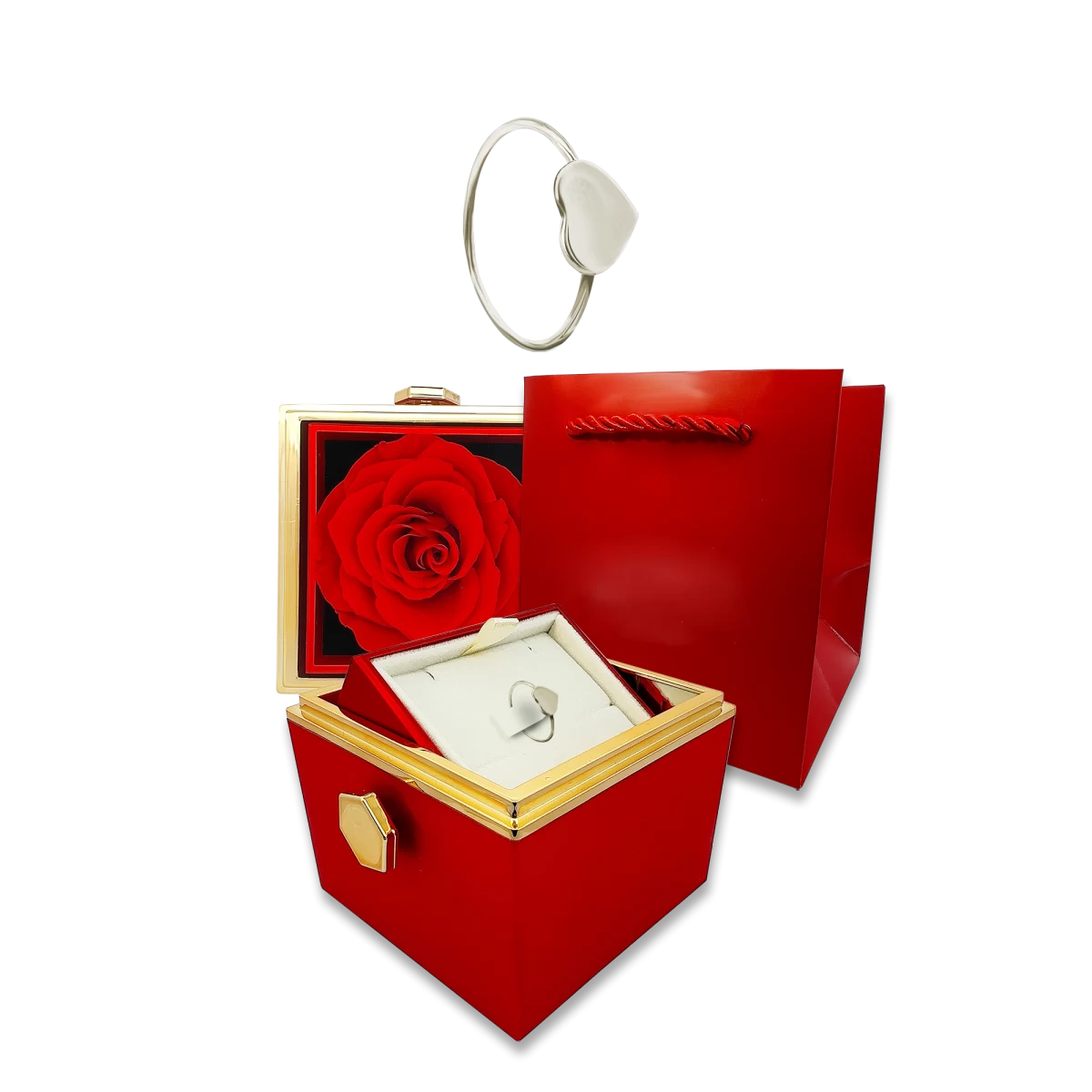 Ha egyedi és maradandó ajándékot keresel, válaszd a szív formájú gyűrűnket, amely egy elegáns rózsadobozban kerül bemutatásra, így nem csak egy gyönyörű ékszert adsz, hanem egy olyan különleges meglepetést is, amely a szeretet és szerelem kifejezésének új dimenzióját nyitja meg, köszönhetően a dobozban lévő rózsának, amely akár 3 évig is megőrzi frissességét.