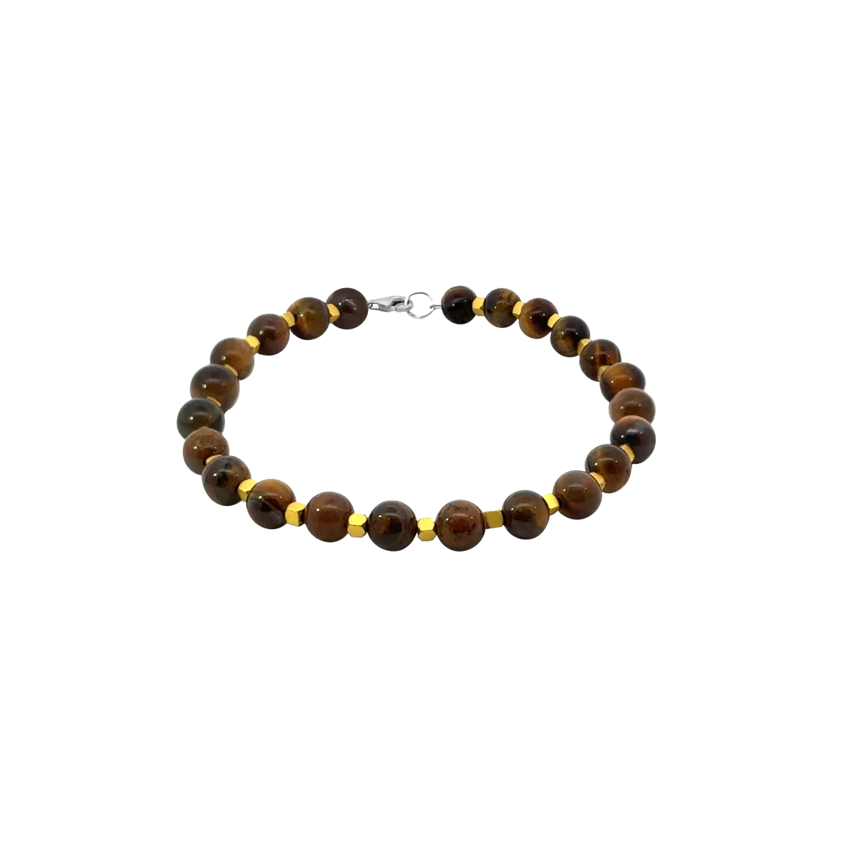 Engedd szabadjára a belső erőd ezzel a férfi karkötővel, amelyet karakteres tigrisszem ásványok és feltűnő sárgaarany színű hematit elemek tesznek igazán különlegessé. A karkötő a tigris erejét és eleganciáját idézi, így tökéletes választás mindennapi viseletre vagy különleges alkalmakra. A tigrisszem régóta ismert védelem és személyes erő köveként, amely támogatja a koncentrációt, fokozza a magabiztosságot és az önbizalmat, miközben segít egyensúlyban tartani az érzelmi energiákat. Az arany színű hematit eleganciát kölcsönöz, és a gazdagság, siker és belső erő szimbóluma. Ez a karkötő nem csupán egy stílusos kiegészítő – a bátorság, kitartás és a férfias elegancia szimbóluma is egyben.