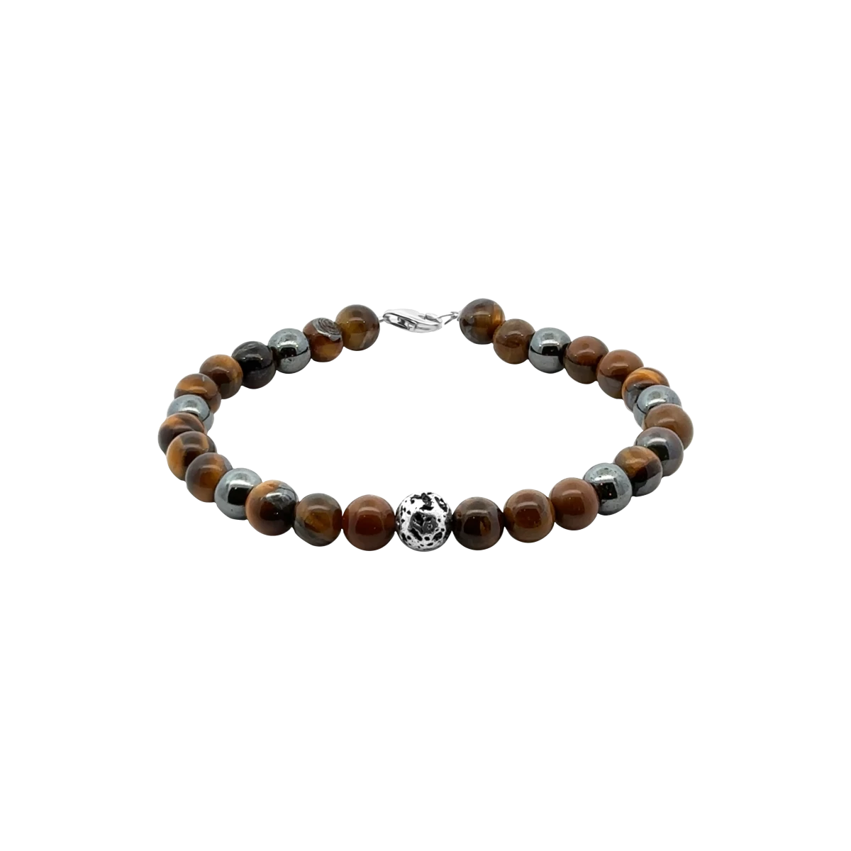 Férfi karkötő tigrisszemmel, lávakővel és hematittal – egy erőteljes és stílusos kiegészítő, amely nemcsak megjelenésedet emeli ki, hanem energiát és belső egyensúlyt is ad. A tigrisszem aranybarna fénye magabiztosságot és belső erőt sugároz, miközben segíti a tisztánlátást és a koncentrációt. A lávakő a természet erejét hordozza magában: megnyugtat, levezeti a feszültséget, és stabilitást ad a mindennapokban. A hematit pedig erősítő ásvány, amely támogatja a férfias energiát, fokozza a vitalitást és segít megőrizni a belső harmóniát.