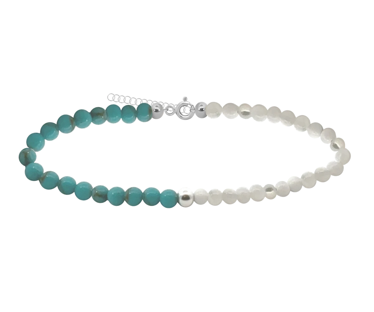 A türkiz ásvány élénk árnyalata és a gyöngyház finoman irizáló fénye harmonikus, elegáns összhatást teremt, ahol a természetes színek és textúrák kifinomultan egészítik ki egymást. A türkiz karakteres megjelenése és a perlmutt lágy ragyogása nőies, könnyed stílust kölcsönöz az ékszernek. A lánchosszabbítónak köszönhetően a bokalánc hossza egyszerűen állítható a kényelmes és személyre szabott viselet érdekében.