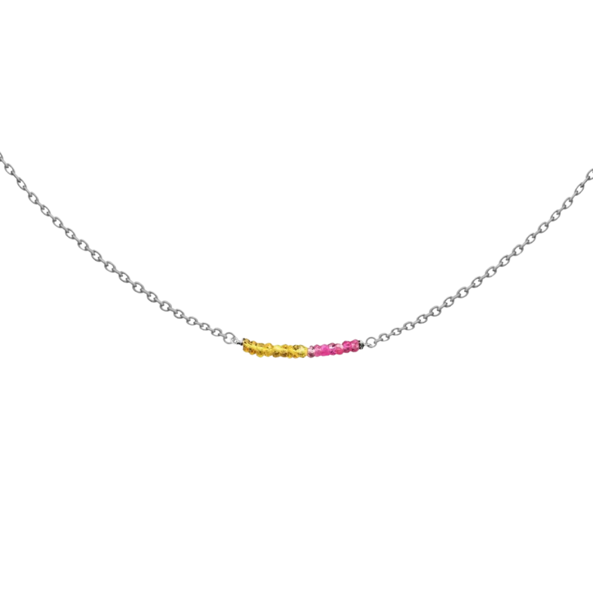 Drágaköves kollekciónk szemet kápráztató darabját viselheted magadon ezzel a gyönyörű nyaklánccal. A sárga zafír és a vörös rubin harmonikus találkozása egy ékszerben, amely benned is felpezsdítheti a tüzet. Alkalmi viseletként ajánljuk.