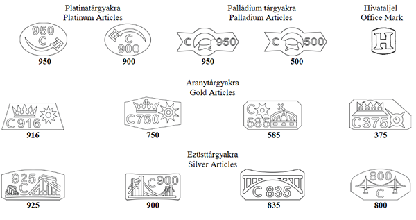 Magyarországon a hivatalos fémjel tartalma egy vagy két szimbólum és egy háromjegyű szám.